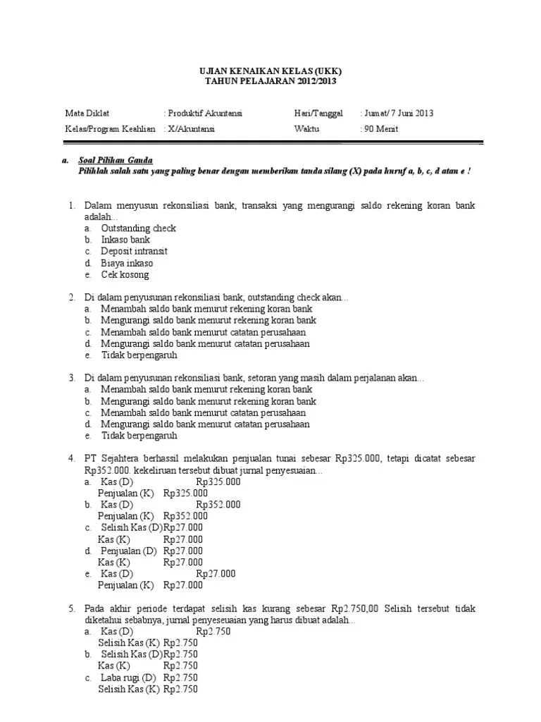 Soal pilihan ganda administrasi umum kelas 10 guru ilmu sosial ilmu sosial teknik otomotif akuntansi keuangan. Semoga bermanfaat bagi para pembaca sekalian, dan untuk menambah manfaat silahkan share. Bagi anda yang ingin mengetahui contoh soal teks eksplanasi beserta jawabannya silahkan lihat link di bawah ini. 50 soal pilihan ganda tentang akuntansi beserta jawabannya. Khusus untuk transaksi bank charges dan interest income dicatat di ….